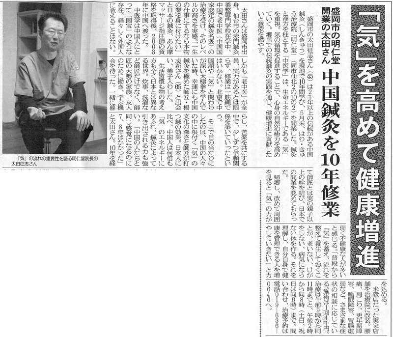 中医学で重要としている「気」の話をはじめ、10年におよぶ中国鍼灸の修行のエピソードも掲載いただきました。普段から「気」を蓄えて流れを整えて養生しておくことが、老いない、けがをしない、病気にならない体を作ります。それを理解し、自分自身で健康を管理できる人を増やしていきたいと考えております。